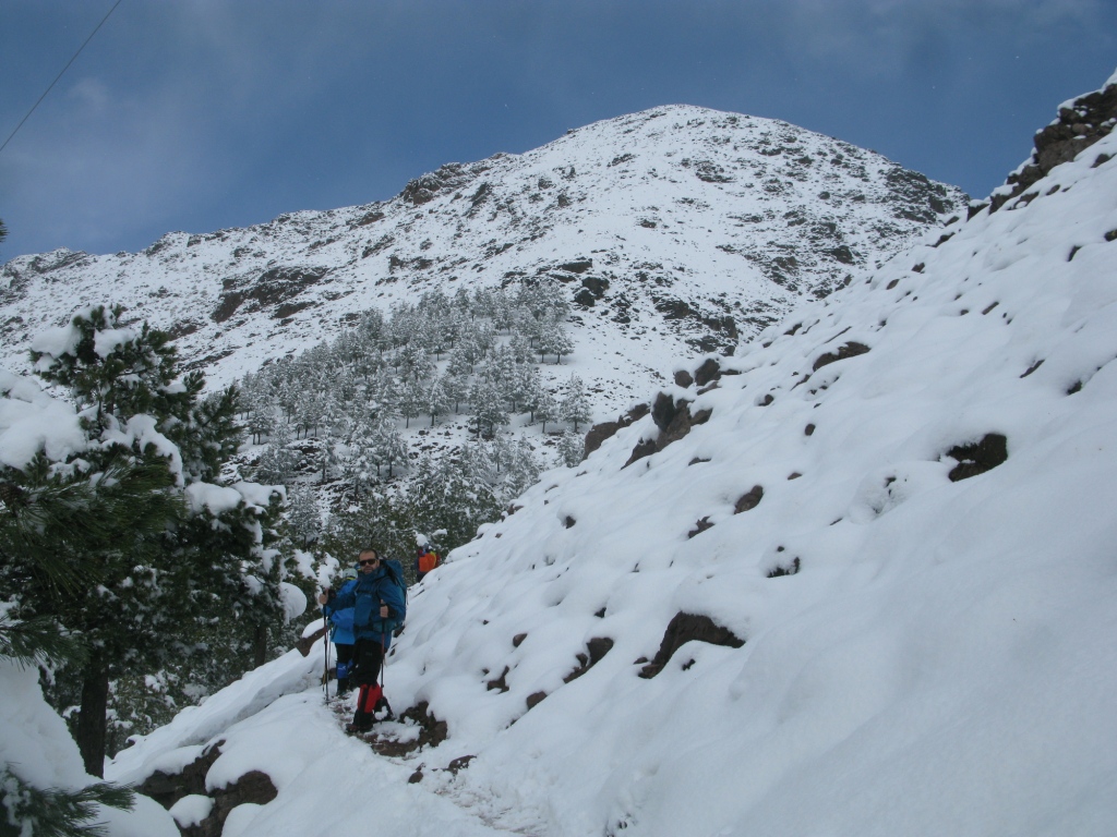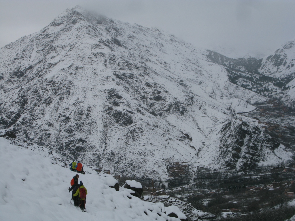 Lo que en un principio parecía ser un plan “B” descafeinado y sin demasiado interés, se convirtió en una bonita y agradable experiencia para todos. En los dos días de actividad subimos dos cumbres panorámicas del valle de Imlil. El primer día el Tasserimoute por el collado de Tizi n´Mzik y el segundo días el Adrar Tamalaroute por el Valle de Tamatert. Y es que el Toubkal casi siempre se puedo ascender sin problemas, de hecho esta era mi 30 vez que venía a subirlo y hasta ahora el éxito había sido del 100% … pero ver el Valle de Imlil completamente nevado y ver caer una copiosa y extensa nevada, es algo realmente inusual y atípico. Bajo esta perspectiva los compañeros de viaje se pueden sentir auténticamente afortunados, ya que lo que estamos viendo estos días raramente se repite.