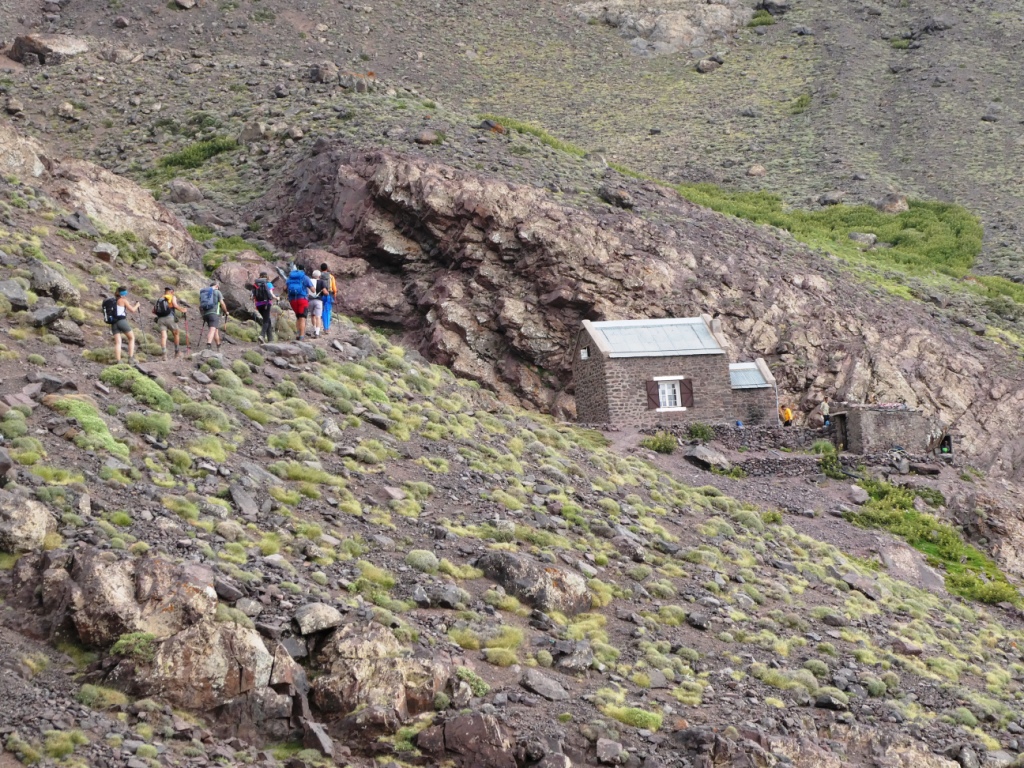 El tercer día de cumbres ascendemos Ras y Timeguida, la tercera y segunda en altura de la cordillera del Atlas, respectivamente. Se nos juntan al grupo más integrantes, aquellos que se han apuntado al programa de la “trilogía”. Este resulta ser el día más tranquilo de todos. Al medio día estamos todos disfrutando de una buena comida en el refugio y tenemos toda la tarde para descansar, disfrutar del maravilloso mundo de las redes sociales (en el refugio hay wifi) y de pasear por las inmediaciones. Damos la bienvenida a nuevos integrantes, aquellos que han venido por el programa “Toubkal Exprés”