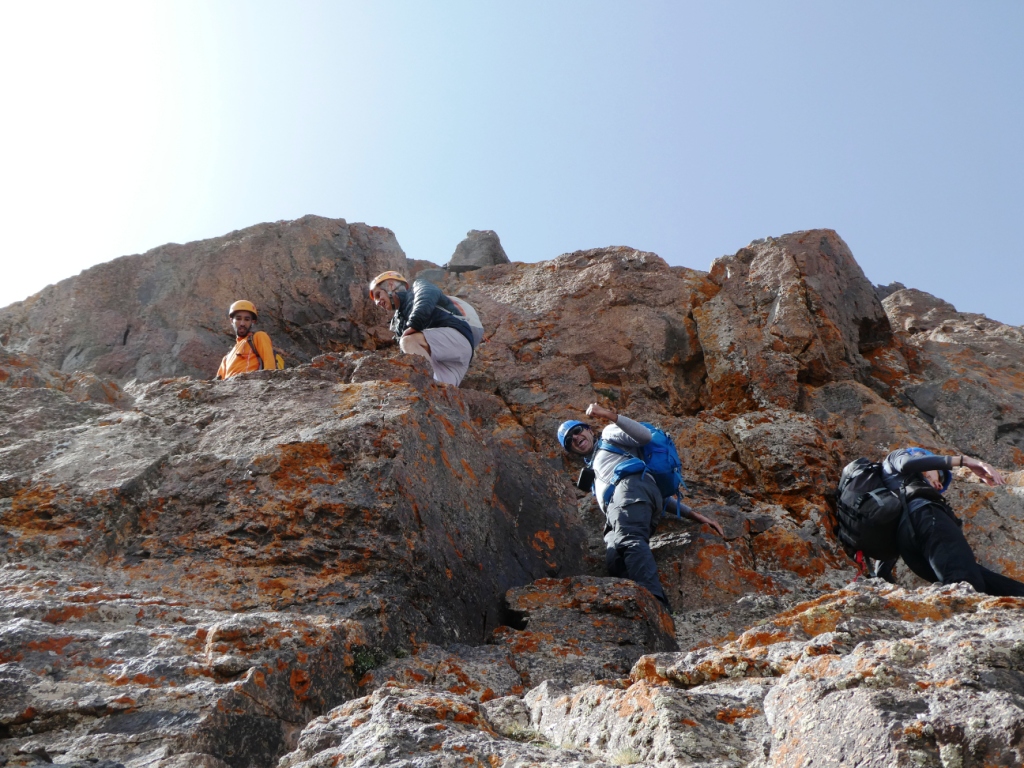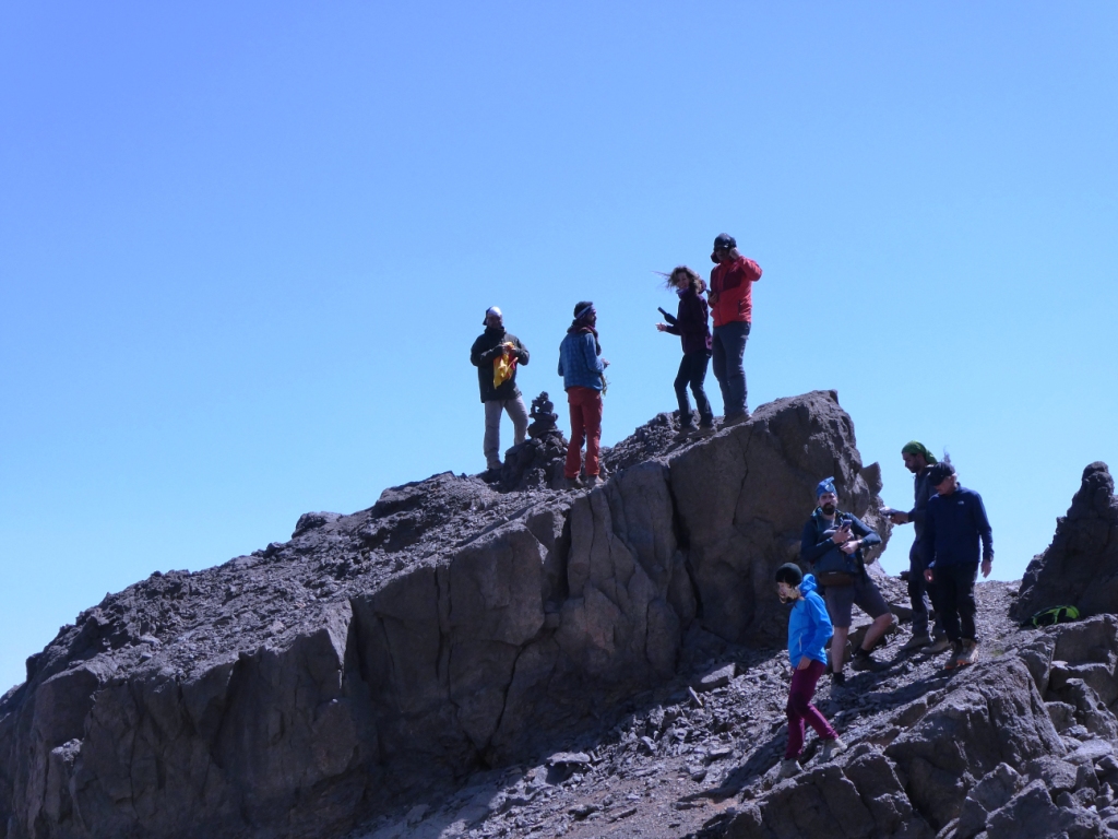 El primer día de actividad en cumbres, ascendemos al Biguinnoussenne, el 4 mil principales más bajitas y a la vez más técnico del Alto Atlas. Por suerte este año el terreno está completamente seco y disfrutamos de un tiempo excelente, por lo que todo el equipo sin excepción corona la cumbre. Justo a pocos metros de la misma localizamos unas sorprendidas cabras que nos observan con suma curiosidad. Al ver que la “hermandad del caza 4miles” es pacífica y ha venido en son de paz, vuelven a relajarse y se quedan estacionales en la misma plataforma, sin intentar huir. Uno no deja de preguntarse porque narices están a tan cerca de la cima, en un lugar donde solo hay piedra y no se pueden proveer de comida. Sea como sea, está claro que a las cabras bereberes les encantan las alturas y las cumbres solitarias.