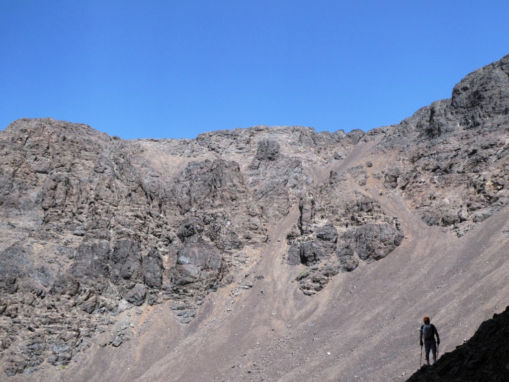 Al bajar por la canal Este hacia el refugio de Toubkal, debemos extremar precauciones. El terreno, sin ser complicado, sí que muestra tramos inestables y algún que otro descenso expuesto. Mohmad y Moustafá, nuestros guías, me comentan que en una próxima edición cambiaremos un poco el programa para evitar este descenso, decisión de celebro y apruebo con gusto. Debo admitir que las dos veces que he bajado con un grupo numeroso por esta inclinada canal se me ha hecho un nudo en el estómago de la tensión y no me he podido relajar hasta salir de la canal. Tensión que por supuesto he sabido gestionar de maravilla de tal manera que ninguno de mis acompañantes ha podido sospechar de ella. Pero la procesión va por dentro.