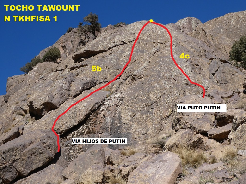 - HIJOS DE PUTIN: 28 m. máximo 5b. Ahora por ahora no está totalmente equipada. A fecha de hoy hay 3 parabolts más descuelgue común con la vía “Puto Putin”. Empieza por un zócalo, slab que da acceso a una fisura bavaresa donde se localiza el paso clave. Luego placa tumbada y disfrutona con buenos agarres.