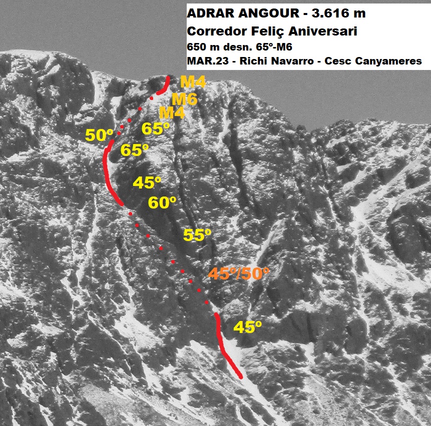 Durante la celebración del Stage de Alpinismo bereber del 2023 se abrieron las dos primeras rutas de escalada a la vertiente O.S.O del Adrar Angour, hasta la presente una de las vertientes vírgenes que aún aguardaba a ser recorrida en la zona del Alto Atlas, como tantas otras.