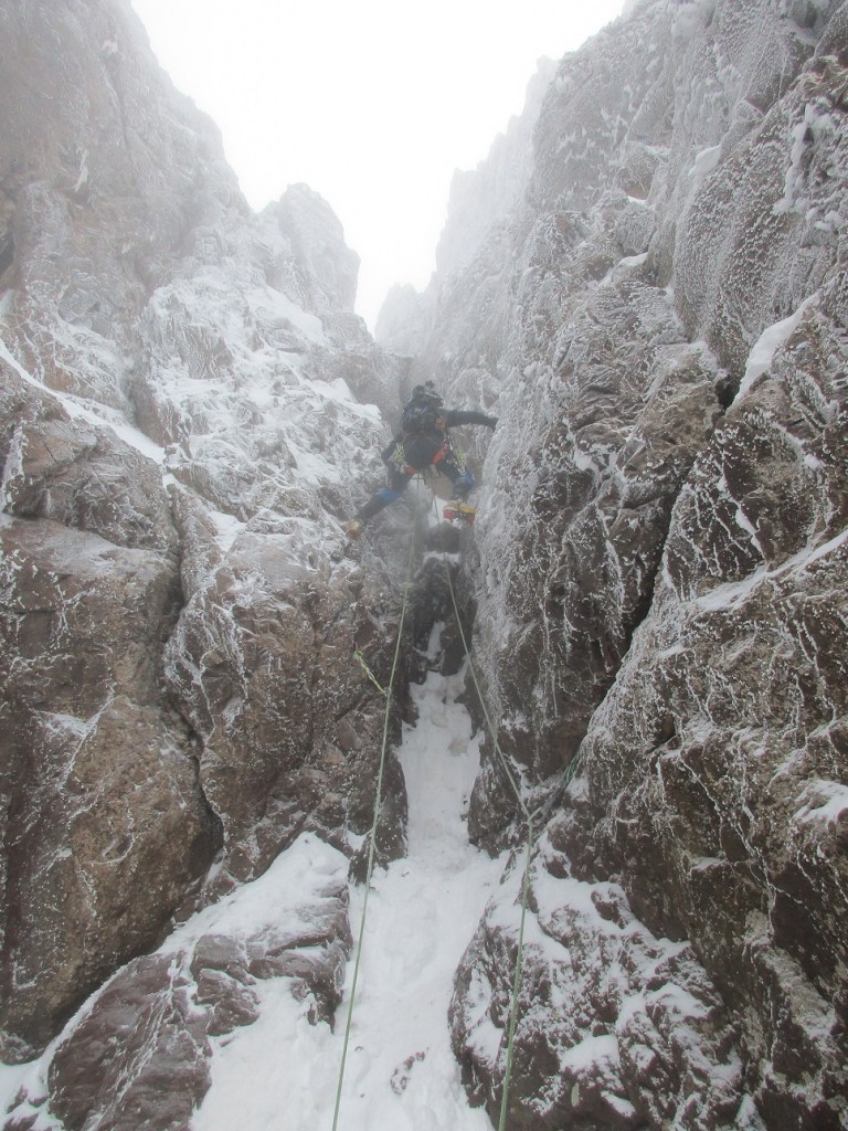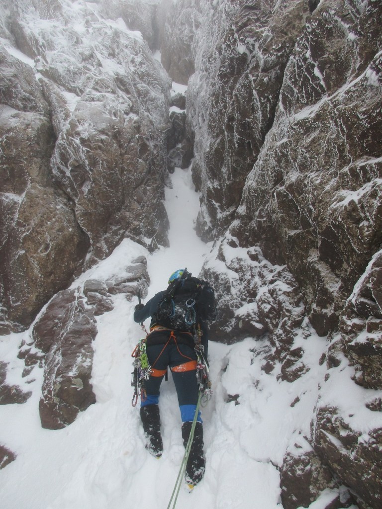 En la parte final se sale recto, evidente, por una chimenea. Hay un primer largo de 20 m de M4 primero y M6 en el segundo tramo. El tramo de M6 es vertical con muy poco agarre en la parte derecha de la chimenea. Protección difícil de realizar. Expo. Un segundo largo de M4 de unos 4/5 m nos deja en una corta canal fácil que desemboca directamente en la arista. Reunión en un bloque de piedra.