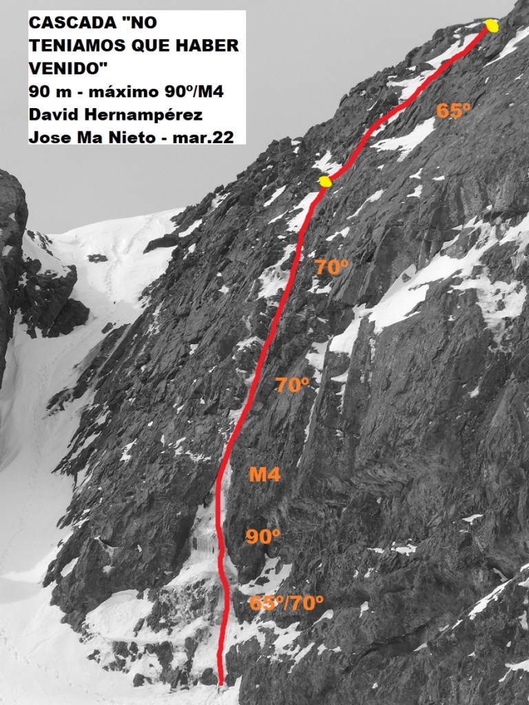Dificultad / datos técnicos: 90 m de desnivel. Media de 65º a 70º. Máximo 90º – M4.