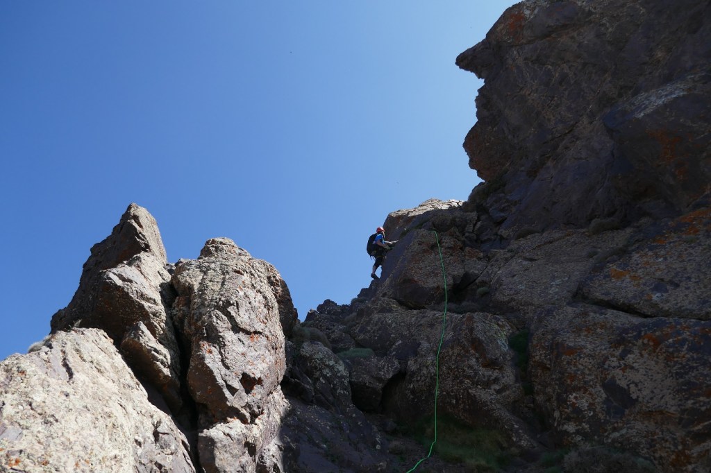 Justo en la parte alta del largo cordal encontramos una última torreta con un tramos de roca naranjo claro (IIº) que representa el final de la zona que se realiza estrictamente caminando. Tras la torreta llegamos a un diminuto collado y subimos en oblicuo hacia la derecha por pendientes de hierba en busca de una canal que, tras un pequeño cinturón de roca fácil y negruzca (Iº) llega a una brecha (inclinación de hierba entre 40º – 45º). Ya estamos en el hilo de la arista principal. Subimos por una especie de canal situado un poco a la derecha y tras coronar una cota nos encontramos de frente el tramo de cresta, ya estamos casi a los 3.000 m de altura, con lo cual la cresta solo representa una sección final de la larga arista.