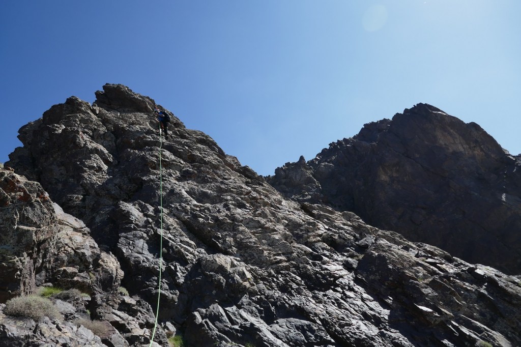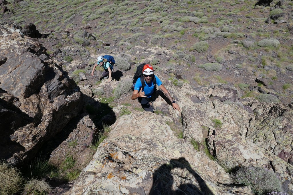 Escalamos la misma de manera directa por una trepada franca de IIIº, hasta situarnos en lo alto del montículo. Ya por terreno fácil superamos una siguiente cota y ya nos situamos de nuevo en un ancho cordal que nos lleva ya sin complicación alguna a coronar la primera de las 3 cumbres del Hdaj. La más alta de las cuales, la central, se eleva a 3.161 m.