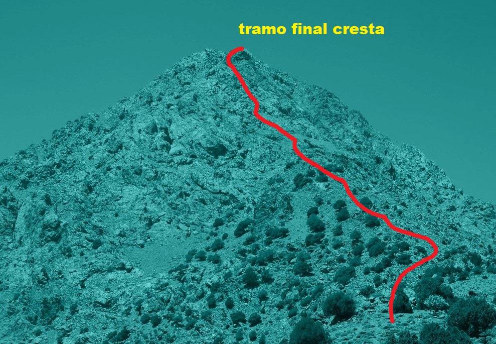 El primer obstáculo en una canal con bloques que presenta también una subida alternativa en diagonal por placa anaranjada. Ambas alternativas son de III-. Tras ello, un pequeño muro vertical nos presenta las dificultades mayores de la cresta. Corto tramo vertical con buenos agarres de III+. Seguimos subiendo por lastras inclinadas de IIº para coronar un gendarme.