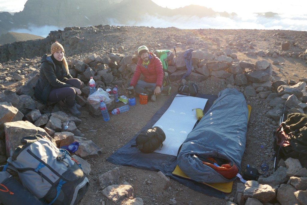 Por la mañana los primeros ascensionistas a la cumbre nos sorprendieron al alba aún dentro de los sacos. El amanecer también fue precioso, pero nada que ver con el alucinante atardecer. Descendimos con al misma calma que ascendimos, contentos de contar con una experiencia más. Una experiencia irrepetible. Ya nadie más dormirá en la cumbre justo el cumple siglos de la primera ascensión del Toubkal ¿O sí? … habrá que esperar al 2123, aunque creo que para entonces … ya no será un tema de mi incumbencia.