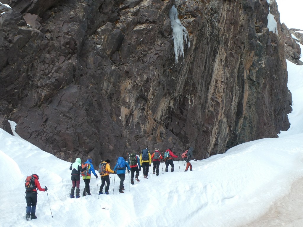 Se trata de un itinerario de corte clásico y sin mayores complicaciones que tener las suficientes precauciones como para no perder el pie en pendientes inclinadas de nieve. Puro trámite para los que nos gustan las palas inclinadas y las escalas fáciles, francas y rápidas.