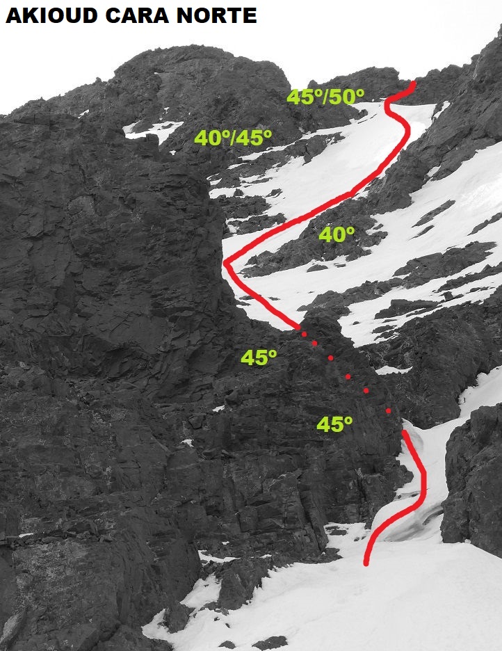 Aproximación: Desde los refugios de Toubkal subimos por la vía normal de Akioud hasta situarnos en el collado de la arista N. Desde aquí descendemos para llegar a pie de la vertiente, flanquear por pendientes de 40º a 45º hasta situarnos bajo la perpendicular de la cumbre, a la que ascenderemos por amplias palas de nieve de moderada inclinación, Calcular de 2:30 h a 3 h para situarnos en el pie de vía.