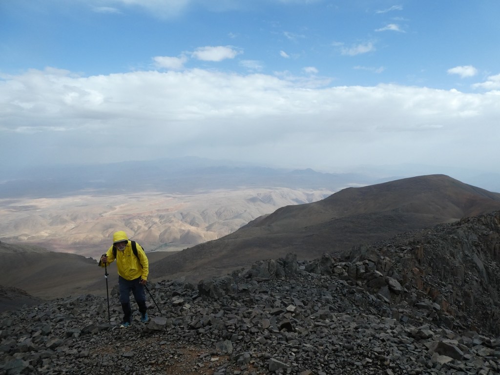La primera vez que caminé cerca de esta mole fue durante la gran travesía de 20 días que realicé con mi hijo (entonces de 13 años) para enlazar M Goun y Toubkal. En aquel entonces descubrí el valle de n’Tinnzer con sus incontables Azibs y dormimos en el altivo collado de Tizi n’Ouoraïne, rodeamos la gigantesca montaña, fotografié sus extensas y redondeadas laderas, pero no tuvimos tiempo ni intención de escalar hasta lo más alto. No en vano la cumbre queda siempre muy lejos y requiere una atención especial de horas que no disponíamos en nuestro plan de travesía.