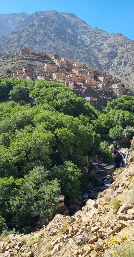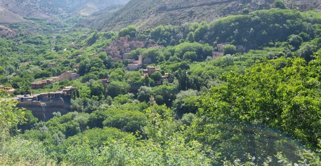 Aremd visto desde la carretera de acceso, al fondo del valle se observa la famosa y turística cascada de Imlil. Buenos contrastes de colores entre el azul del cielo, la tórrida tierra y el verde fondo del valle con los bosques de ribera bien regados gracias a la acción del hombre