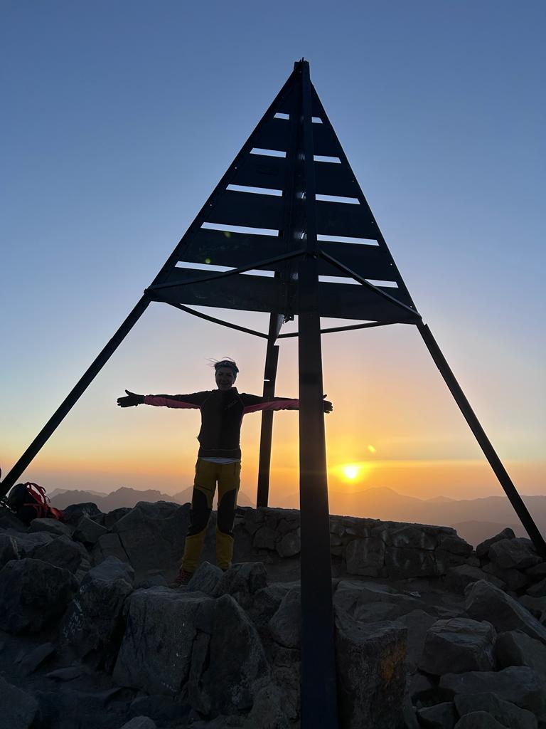 Foto de cumbre. Todo el grupo en lo alto del Toubkal. Como siempre en verano es muy aconsejable madrugar y ver salir el sol desde la cima. Todo un espectáculo que además cuenta con otras ventajas: de noche la subida no se hace tan monótona y el fresco nocturno ayuda a hacer la ascensión más liviana. Más tarde la bajada también se efectuará con unas temperaturas aceptables. Queda tiempo para descansar y comer con calma en el refugio antes de emprender la larga bajada a Imlil.