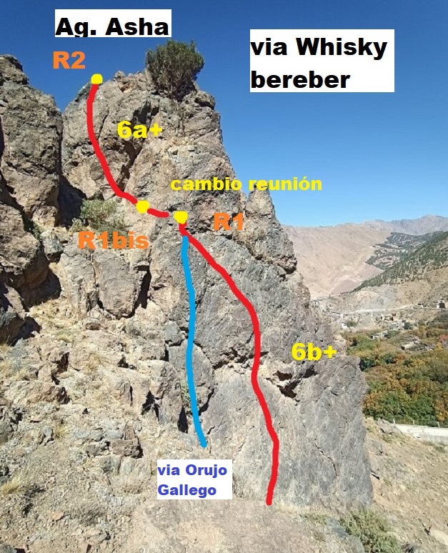 Descripción: El primer largo empieza por una pequeña placa vertical hasta una roza anaranjada donde hay un pequeño desplome y una placa de cantos pequeños donde reside el paso clave. Luego en diagonal a la izquierda para llegar a la R1 de la vía “Orujo Gallego”. Salimos hacia nuestra izquierda para hacer un cambio de reunión. (IIº). El segundo largo, muy corto, va a buscar el desplome situado justo a la izquierda de una llamativa bavaresa. R2 en la misma cumbre de la pequeña aguja Asha. 6a+. Descenso a pie.