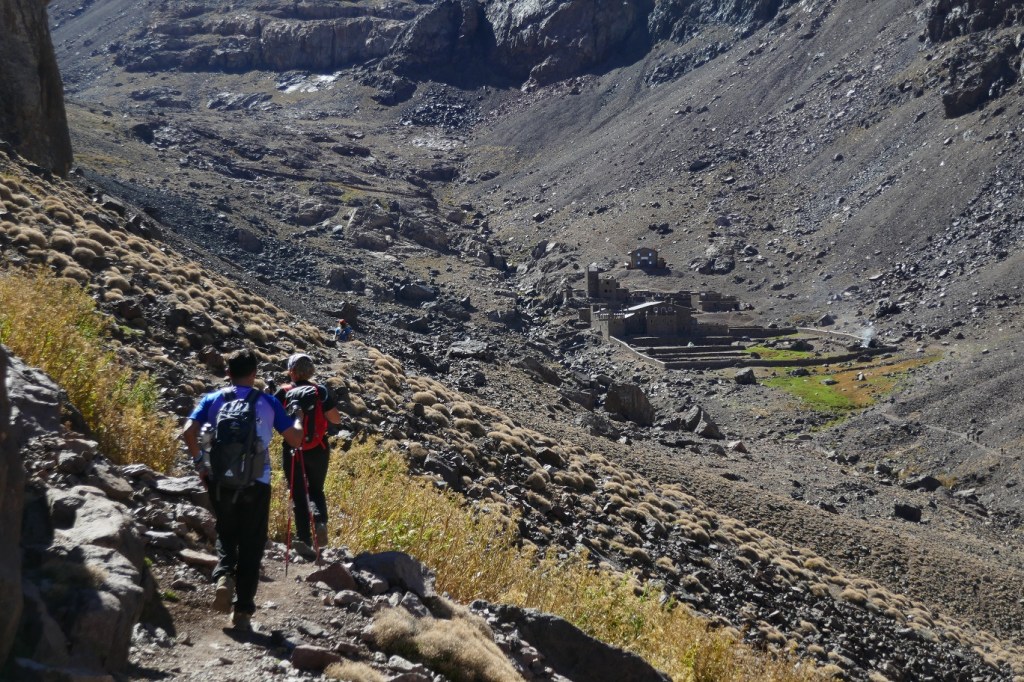 La subida hacia el valle de Tazarhart y refugio Lepiney no tenia ningún derrumbe ni parte del camino afectada. La parte más visible por afectación es el Azib de Tamsoult, que estaba en reconstrucción tras la afectación del terremoto. También eran destacables las marcas de caídas de piedra y las piedras con señales de haber caído recientemente en la zona más cerrada de la garganta de la cascada d’Irhoulidine. La verdad que, este lugar en concreto, debería convertirse en un verdadero infierno en el momento del temblor.