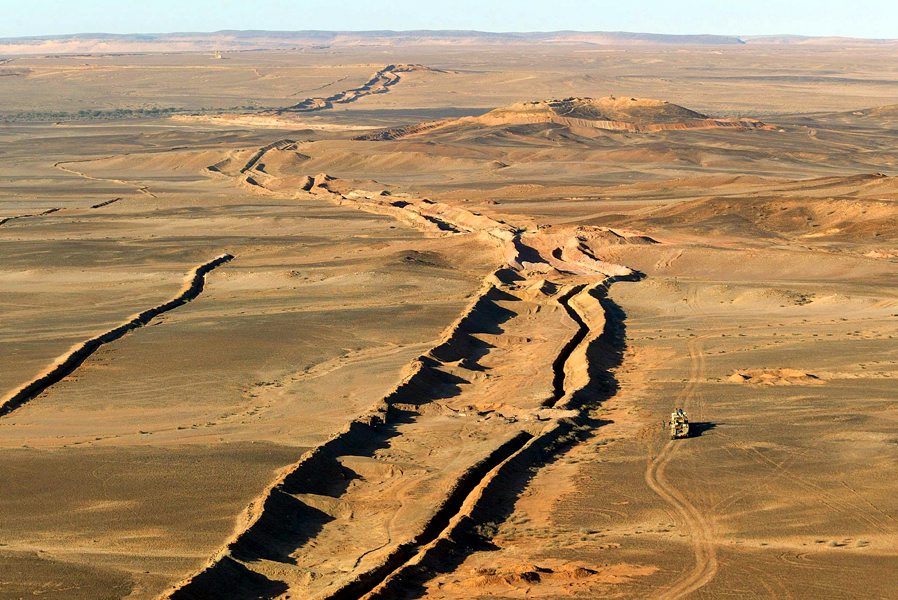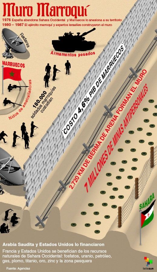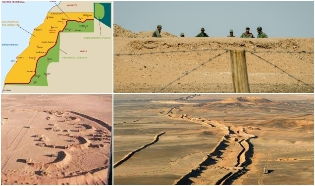 El “Muro del Sahara Occidental” fue construido por el ejército marroquí con la ayuda de expertos israelíes y la asistencia financiera de Arabia Saudita y de Estados Unidos. Esto explica que el muro tenga búnkeres, vallas equipadas con armamento estadounidense, saudita y francés, siete millones minas antipersonales, nidos de ametralladoras, radares y otros armamentos pesados. Todo esto con la finalidad de crear una línea divisoria entre los territorios ocupados por Marruecos y aquellos liberados por el Frente Polisario, impidiendo así la vuelta de los refugiados saharauis a su país.