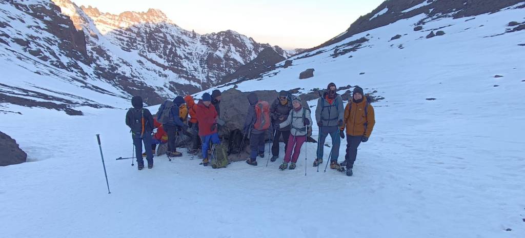Parada para reponer fuerzas y reagruparse a medio camino del ascenso del valle de Ikhibi sur, camino al Toubkal. Estamos, más o menos, a una altura de 3.700m. A tener el valle oriente oeste, el bajo sol invernal de mañana se resiste a bañar el mismo hasta bien entrado el dia. Con casi total seguridad no sentiremos los agradables rayos de sol en la cara hasta las proximidades del collado previo a la arista somital.