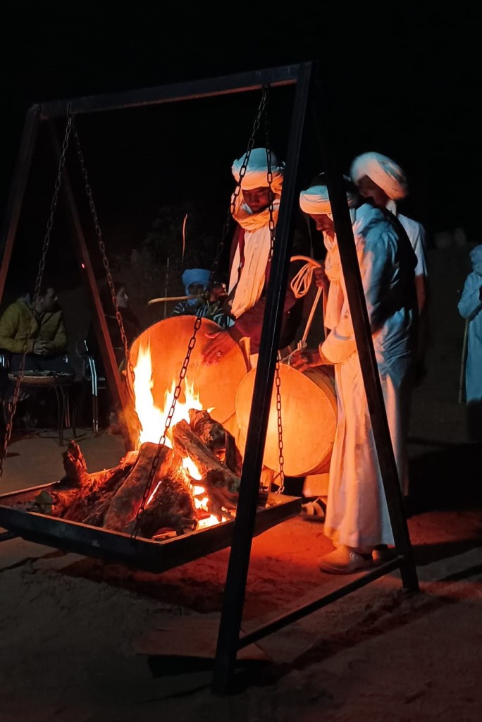 Calentando tambores para las danzas bereberes nocturnas. Una genuina, agradable y diferente manera de celebrar la noche que da la bienvenida al año nuevo. Los ritmos ancestrales de los cantantes venidos del desierto son pegadizos, y en poco rato todos los asistentes se mueven llevados por la magia de la música, el fuego y las infinitas estrellas que adornan la nítida cúpula celeste del desierto