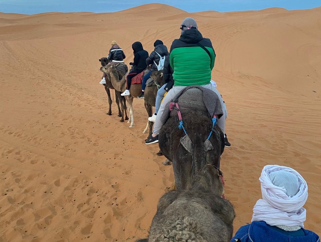 Caravana de tarde sobre camellos para llegar al campamento de jaimas donde celebraremos el fin de año. “masaje salvaje” del dromedario bereber. 45 minutos de marcha sobre estos dóciles animales nos llevará a nuestro emplazamiento entre grandes dunas