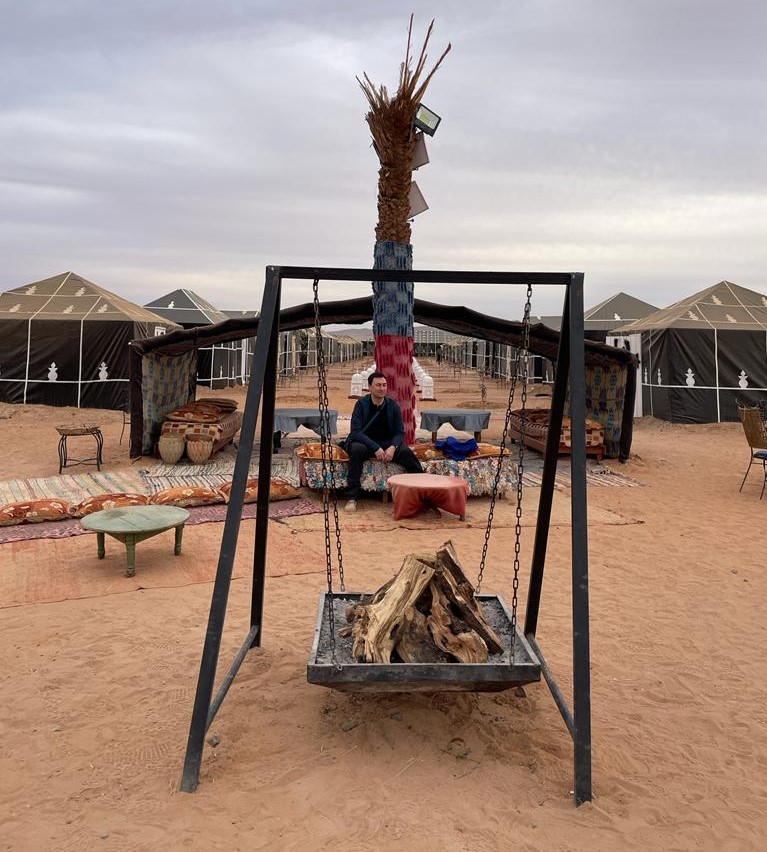 Al llegar al campamento todo está preparado. Las confortables jaimas, la leña dispuesta para el fuego nocturno, las cocinas a pleno rendimiento preparando el tajín o cous cous “royale”. Es tiempo para descansar del largo viaje y de la caravana de camellos. Podemos descansar en el campamento esperando que llegue la hora de cenar o subir a alguna de las numerosas y cercanas dunas para ver la última puesta de sol del año.