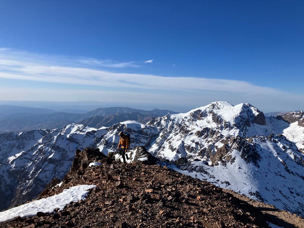 En la parte alta de la montaña las vistas se extienden sobre multitud de sierras cercanas y lejanas cordilleras como el Anti Atlas. Por efecto del viento casi siempre hay menos nieve en las partes altas que en el valle por el cual hemos subido previamente y que recibe el nombre de Ikhibi Sur.
