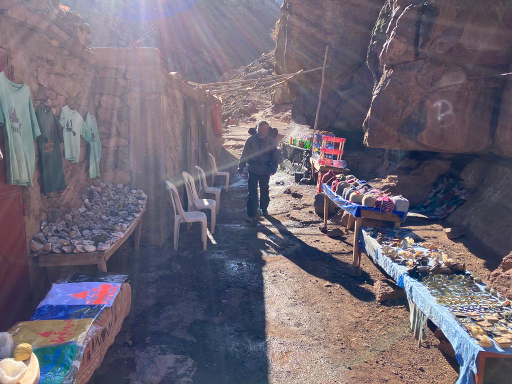 Uno de los múltiple chiringuitos que encontramos en la larga pero cómoda subida de Imlil al refugio Toubkal. Con el sol lateral de tarde y temperaturas templadas y tenues, en el fondo agradables, podemos tomar un te, un refresco, una naranjada ….