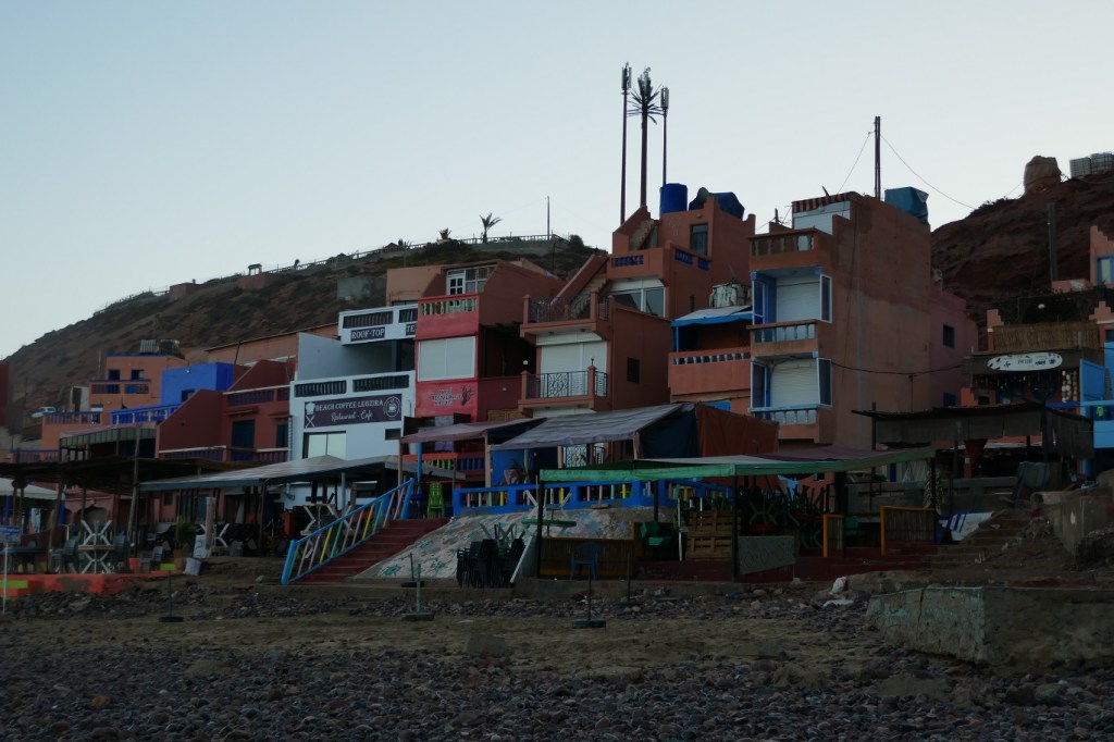 Camino a Sidi Ifni hay una visita obligatoria en la costa Atlántica marroquí, que es la playa y el Arco de Legzira. El acceso es evidente a pesar de no ser visible desde la carretera. En la parte superior de la costa, a primera línea del acantilado que se desploma, hay una especie de urbanización, un poco decadente, que cuando nosotros visitamos la zona, mostraba un aspecto bastante desamparado.