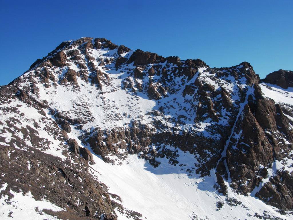 Lejos queda mi primer ascenso del año 1991, en pleno inicio de la juventud. El Toubkal fue el testigo de mi primera cumbre extraeuropea. Muy diferente estaba entonces la montaña, nada que ver con los marcados caminos que suben y bajan por los valles de Ikhibi Sur. Por aquel entonces el pedregal aún era muy movedizo y la senda, mucho menos marcada que ahora, era sustancialmente más penosa. Eso sí, el horrible parapeto de hierro de la cumbre, ese triangulo de 4 alas tan feo, ya estaba horriblemente plantado en lo más alto.