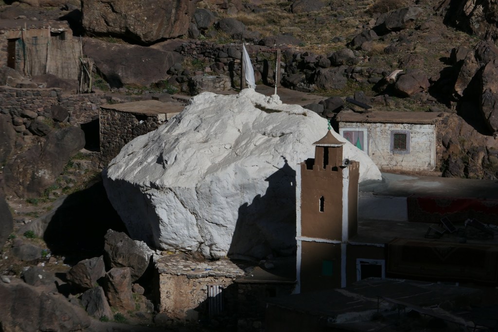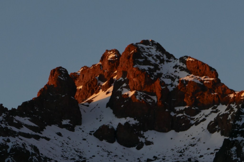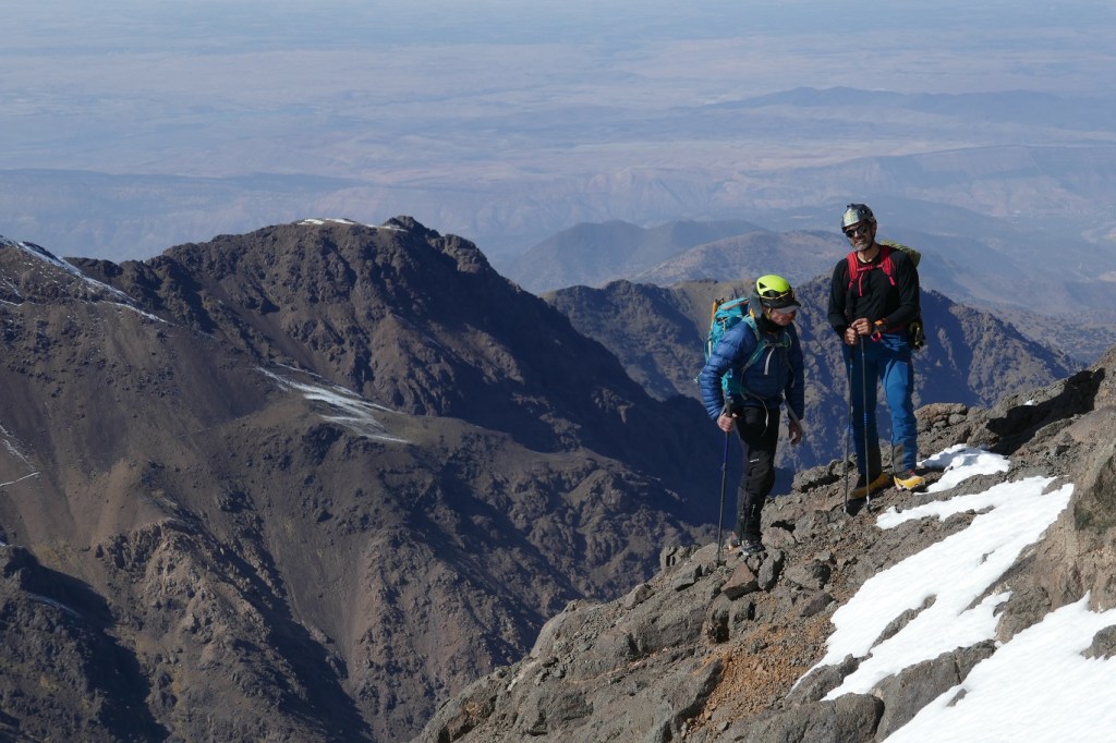 Tras reunirnos con la cordada “Un moment siusplau” (nombre de la otra vida abierta al Toubkal en aquella jornada) subimos todos juntos a la cumbre del Atlas. Frio, viento y unas vistas infinitas. Una buena manera de celebrar mi ascensión número 40 a la más alta de las cumbres de la cordillera. Tras la breve celebración un tanto marchitada por el hiriente y gélido viento, emprendemos la bajada al valle, que prometía ser larga, ya que en esta ocasión no iniciamos el ascenso desde el Refugio de Toubkal, sino que lo hicimos desde Sidi Chamarrouch, con lo que debíamos descender casi 2.000 metros para re encontrarnos con el resto del equipo de Stage y las confortables suites de las pintorescas casas rurales que rodean la piedra blanca de los espíritus.