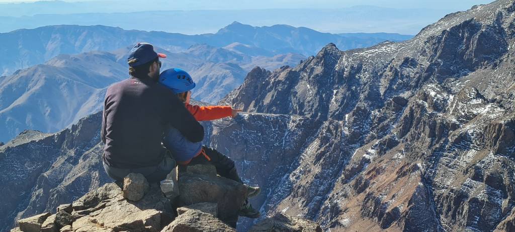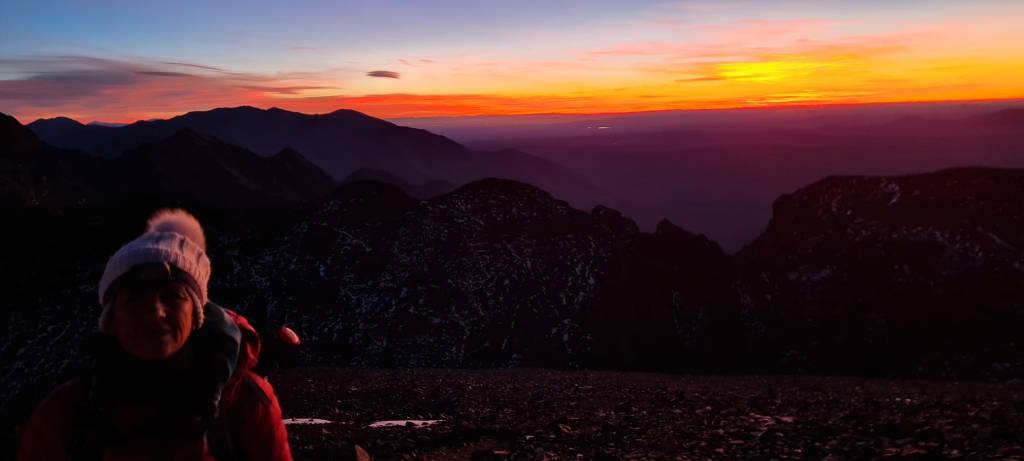 Padre e hijo sorprendiéndose e impregnándose por la inmensidad que se divisa desde el punto más alto del Atlas. Cumbre del Toubkal. (Abajo) Amanecer invernal en el techo de Norte África. Simplemente … impresionante. Espectáculo natural en estado puro.